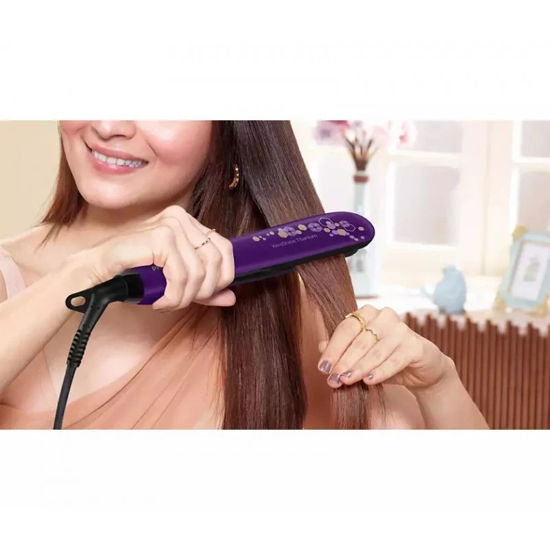 Style it up. Smooth it down. With instant shine. Our Kera-Shine Titanium straightener delivers the style with instant shine while being gentle on hair. The Silk-Protect technology and ceramic titanium plates glide gently through your hair, while optimizing temperature for less heat exposure. Kerashine Titanium plates for fast heat transfer and shine SilkProtect Technology cares for your hair Ionic care for shiny, frizz-free hair Long plates to straighten or to create waves Fast heat-up time, ready to use in 60 sec 1.6m cord A useful swivel cord rotates and prevents tangled wires Key-lock function for safe and easy storage Universal voltage for worldwide use 2 temperature settings at 190°C and 210°C 210°C styling temperature
