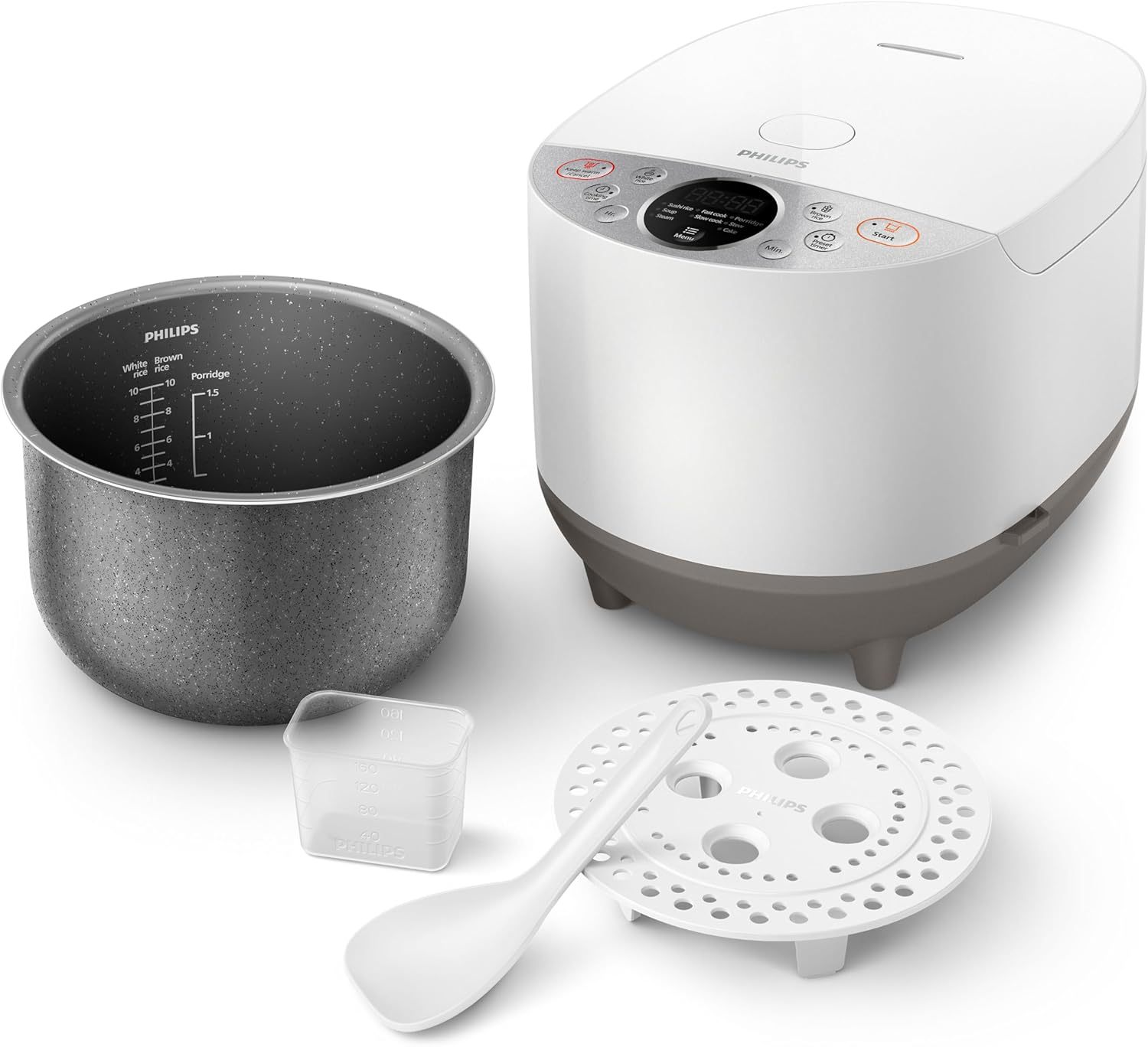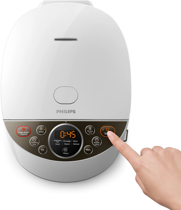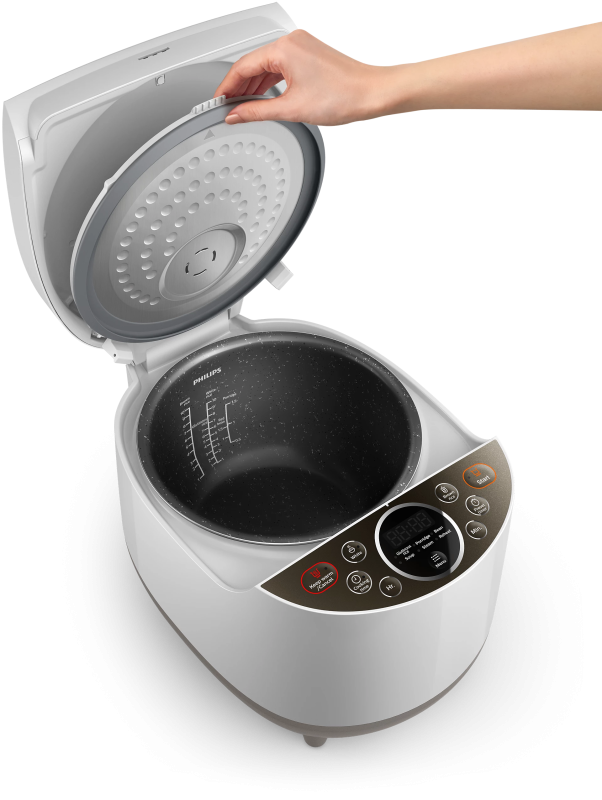 Cook perfectly fluffy rice and delicious meals effortlessly with the Philips HD4515 Digital Rice Cooker. Featuring Smart 3D heating technology, it circulates heat from the top, sides, and bottom, ensuring every grain is cooked evenly. The long-lasting Bakuhanseki-coated inner pot is 6X harder than traditional non-stick coatings, durable, and enriched with minerals for healthier cooking.