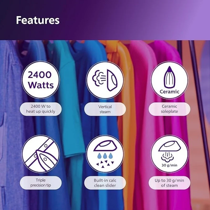 Easy-Speed Plus speeds up ironing with powerful bursts of steam to tackle tough creases, a durable ceramic soleplate for easy gliding, and our drip-stop system to prevent leakage. That's three easy ways to make fast work of your ironing. Steam Iron. 2400 watts to Heat up Quickly. steam boost.30 gram/min continuous steaming.Swivel:360 degree Ceramic Soleplate. Water Tank Capacity:270 ml. Cord Length:1.9 cm. Power Input:220 - 240 V.