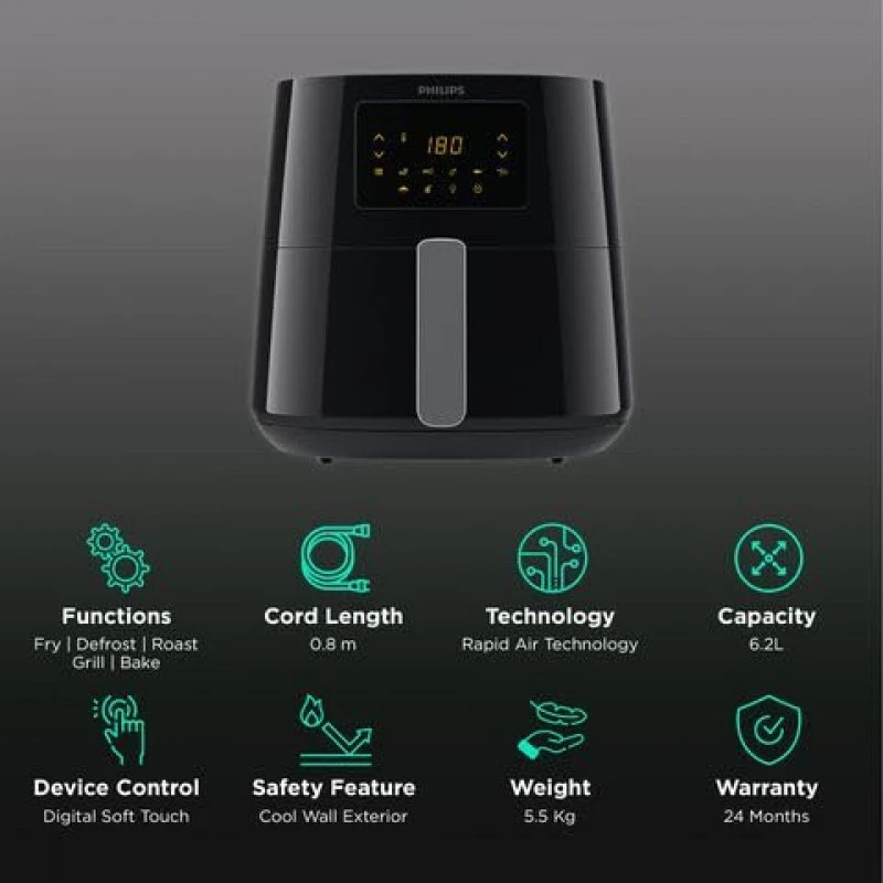 Philips brings the World’s No.1 Airfryer to everyone’s home. Enjoy healthy food that's crispy on the outside and tender on the inside, thanks to Rapid Air Technology. Power: 2000 Watt Capacity: 6.2 Litres Functions: Fry, Defrost, Roast, Grill, Bake Controls: Digital Soft Touch Display: LED Preset Menus: 7 Big XL Size-6.2 L, 360 Degree Even Cooking, Detachable Basket, NutriU App for recipes, Touch screen Menu 2 Years Warranty