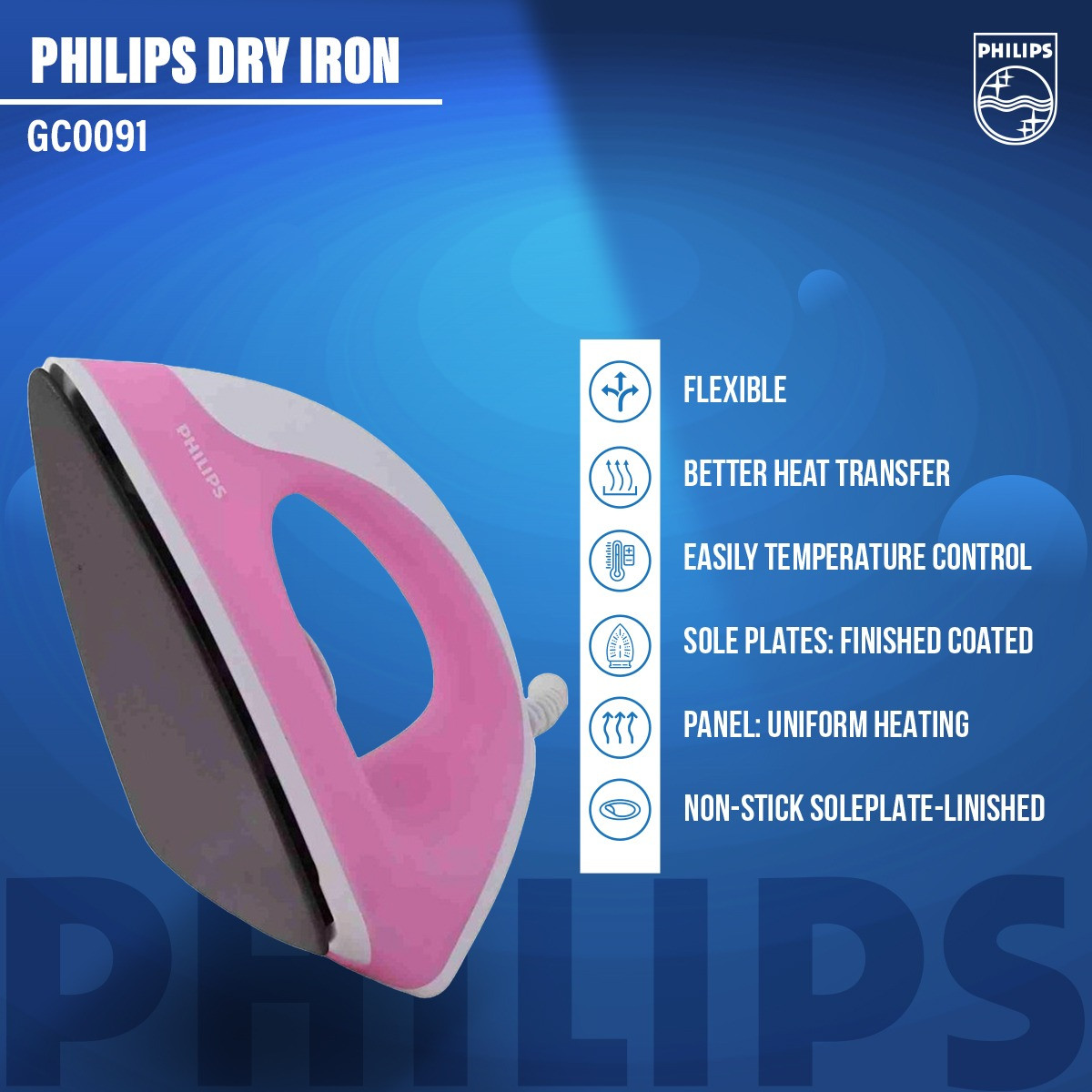 Experience effortless and effective ironing with the Philips GC091 Dry Iron. Designed for everyday convenience, this dry iron delivers uniform heating with a non-stick soleplate that glides smoothly across fabrics. The precision tip allows you to reach tricky areas like collars, buttons, and pleats with ease. Its lightweight design and ergonomic handle ensure a comfortable grip and better maneuverability. With 750W quick heat-up, button groove for better reach, and 180-degree swivel cord, the GC091 makes ironing a smooth and hassle-free experience. The stylish pink color adds a modern touch to your home appliances.